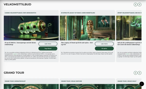 Vores primære casino-tilbud til Danmark er en 100% matchbonus op til 1.000 DKK med en minimumsindbetaling på 100 DKK. Vi tilbyder også 50 Cash Spins uden indbetaling, listet som et no-deposit-tilbud uden omsætningskrav på disse spins. Det giver nye brugere to klare startpunkter: værdi ved indbetaling og en lettere måde at prøve udvalgte spil først. Hvis du søger efter en MrGreen bonus, der er enkel at gennemskue, er denne pakke det vigtigste sted at starte.